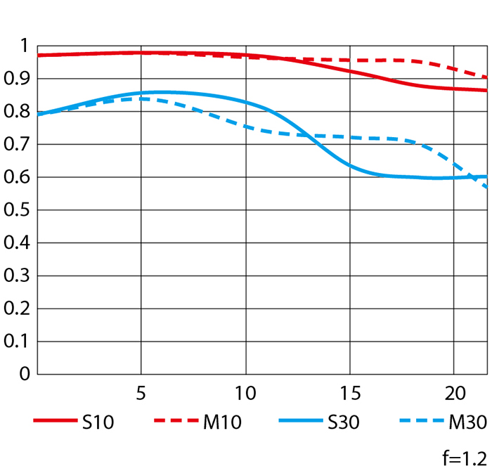 ⭕蓝线(30lp/mm)在0.75左右,锐度比较好。