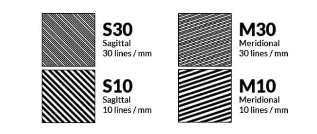 从CMOS成像中心到其上任意一点的线段,与之平行的黑白线条块称为Sagittal(S),中文矢状,一般用实线表示。而与之垂直的黑白线条块称为Meridional (M),中文子午,一般用虚线表示。如图P04所示。S线与M线分的越开就说明像差越大,表现出来的也就是说不够锐利。