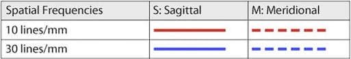 如图P01所示:MTF曲线带有不同的颜色,通过曲线图下方表格(P03)可知,不同颜色分别代表不同的Spatial Frequencies(空间频率):10lp/mm(红线)及30lp/mm(蓝线)。