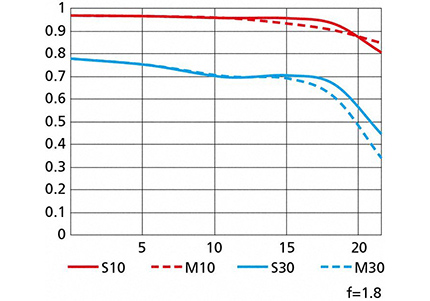 30lp/mm的纵轴数值不够高导致不够锐,和S线与M线分的比较开导致不够锐,两者的成因是不相同:者是因为镜头本身的解析力不足导致的,后者则是因为镜头在不同反向上的解析力差别较大导致的。