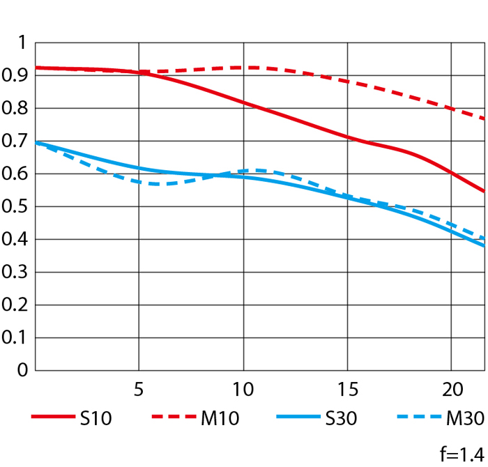 ⭕蓝线(30lp/mm)在0.85左右,锐度极好。