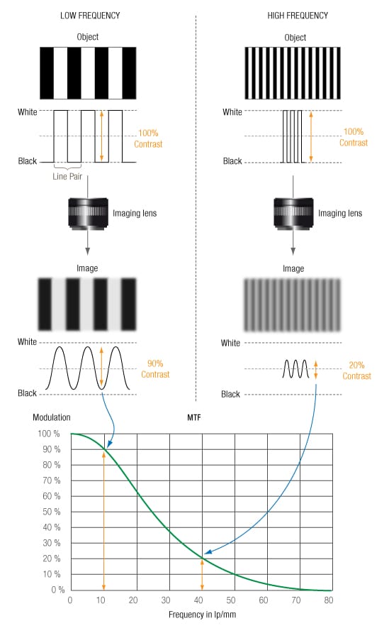 每毫米的线对数越高,则表示空间频率越高。低的空间频率代表对比度(整体轮廓),高的空间频率代表分辨率(细节,锐度)。因此: