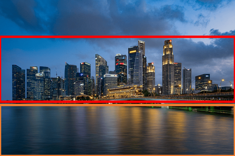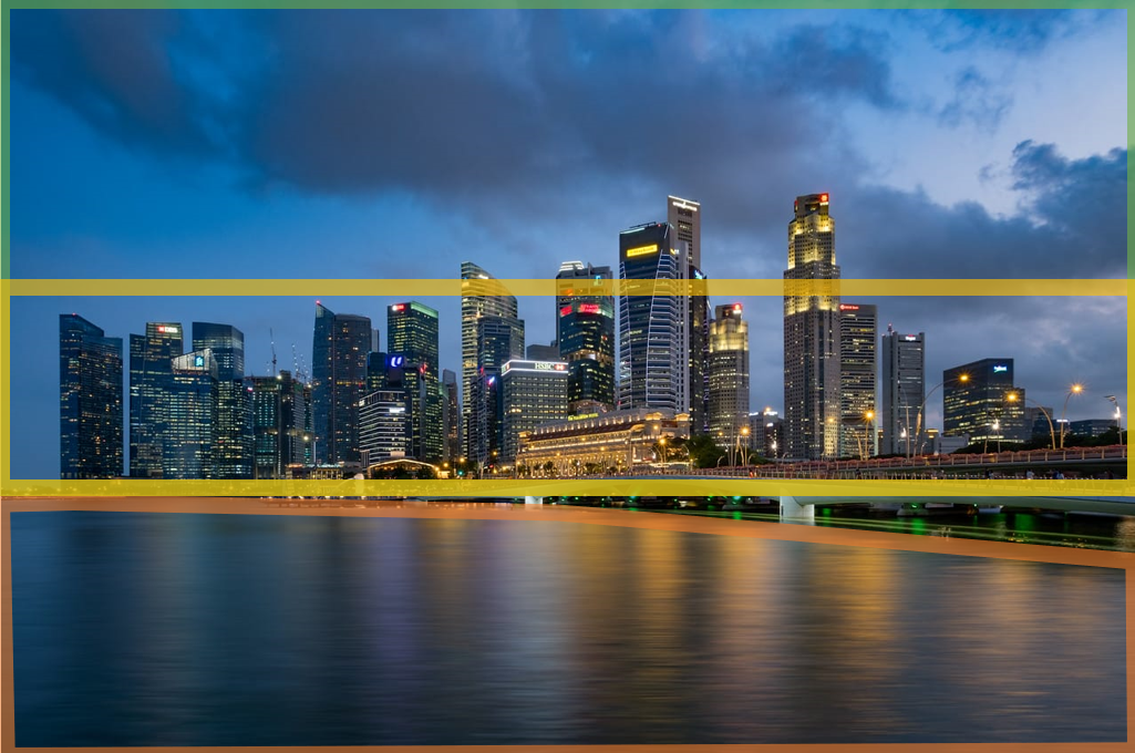– C. 视觉重心:第一视觉重心位于<右上方>:这一部分是照片中最亮的部分,也是建筑中最高的一块,城市灯光与水面倒影与夜空蓝色也在这一区域形成冷暖对比,继续突出了这一视觉重心。